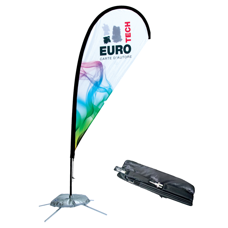 The second is the Flag System, porta banner a colonna per l’esposizione di bandiere all’esterno. Composto da asta verticale rigida in allumino e asta pieghevole terminale in vetroresina con fissaggio dell’immagine alla base dell’asta verticale con gancio a catenella. Excluding support and the water bag (recommended for the foundation to X). Choose from the menu the type of media preferred. Print included.