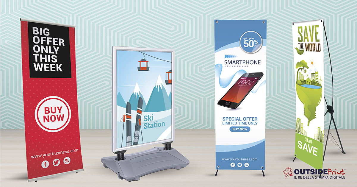 The exhibitors x banner sono espositori per fiere ed eventi molto semplici da montare. Sul sito di OutsidePrint è possibile scegliere tra 3 different models: il più semplice è L-Banner composto da una struttura ad L in alluminio su cui si monta un banner in PVC monofacciale a dimensione fissa, oppure l’X banner con struttura a X oppure il prodotto più strutturato, theoutdoor poster stand da esterno che richiude al suo interno un doppio poster a misura fissa di 60*85cm.