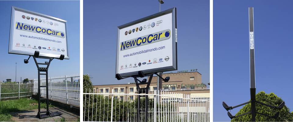Si tratta di un cassonetto realizzato in lamiera in cui viene inserito il telaio portante su cui vengono applicati i due pannelli in plexiglass opalino personalizzati a caldo con la stampa in PVC. Per garantire la durabilità della digital print, la stampa in PVC vinilica viene plastificata con una pellicola anti-UV e anti graffi specifica per esterni.