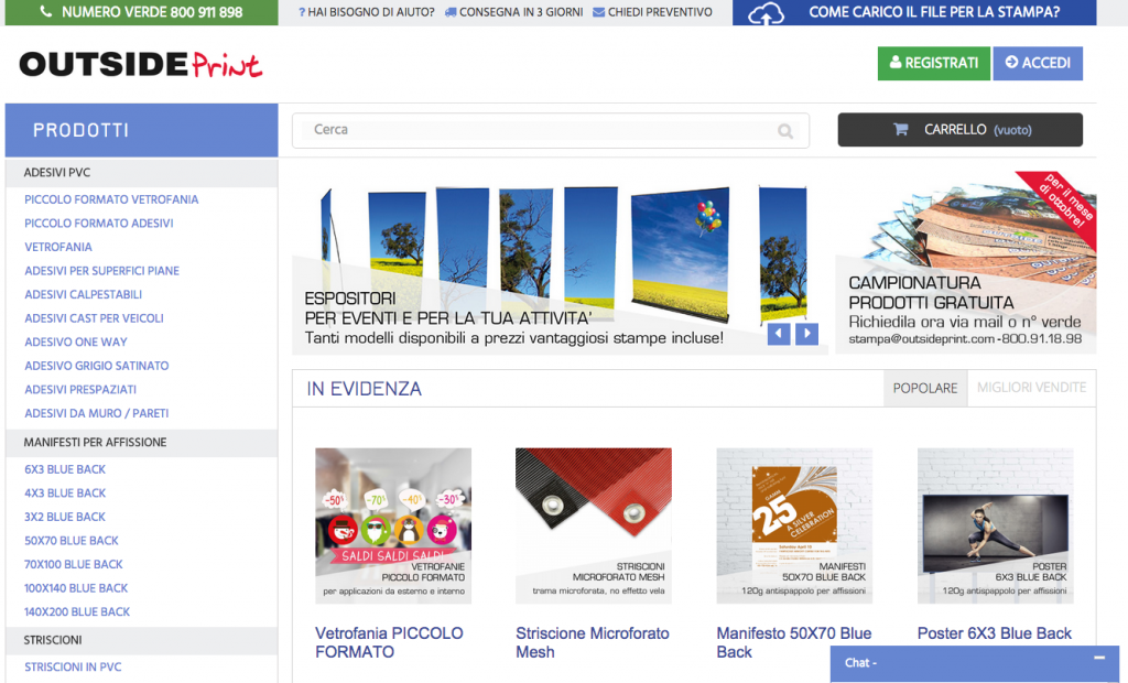 Il menù di sinistra elenca i prodotti personalizzabili che Outside Print propone, mentre nella sezione centrale del sito sono in evidenza i prodotti più richiesti e i prodotti in offerta.