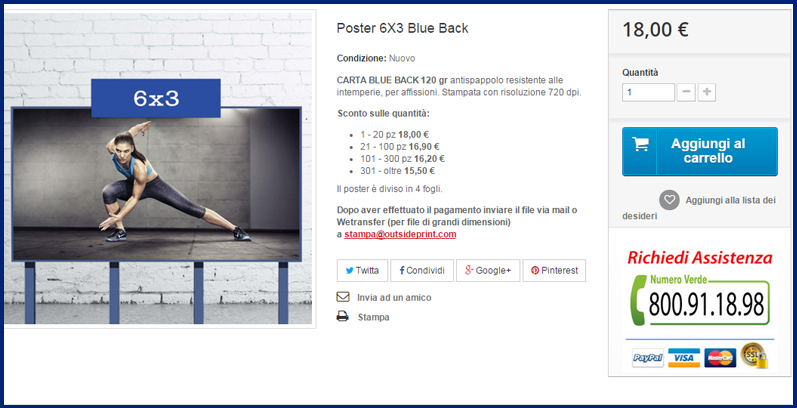 Uno dei prodotti più utilizzati per questo fine è appunto il POSTER 6X3 BLUE BACK che ha la caratteristica di avere una spalmatura blu sul dorso che rende invisibili le affissioni sottostanti. Per questo poster viene utilizzata carta da 120 grammes, anti spappolo, stampata con inchiostro ECO SOLVENT grazie all’utilizzo di macchine Mutho di ultima generazione capaci di ottenere colori brillanti.