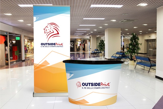 Nuova offerta di OutsidePrint per l’allestimento di stand composta da un Desk per Stand, un banchetto promozionale da esposizione, e da un Roll-Up Deluxe, un espositore avvolgibile con un’ampia superficie stampabile in alta qualità.