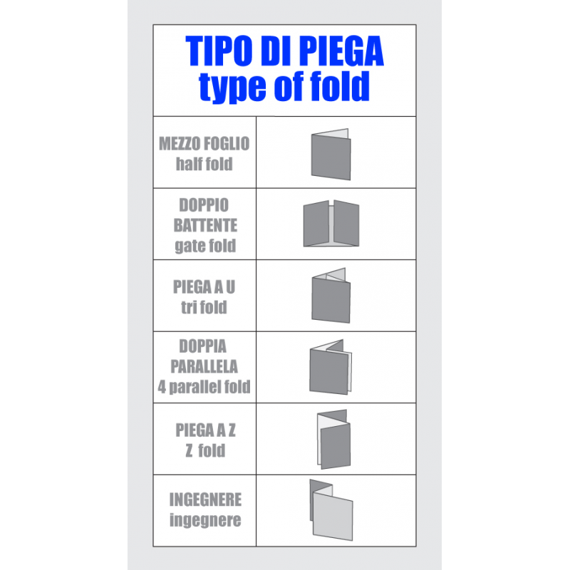 The different folds that are in the middle sheet, also called half fold, the double doors also called gate fold, that U also called tri fold, the dual parallel call 4 parallel fold, the Z and the Engineer!