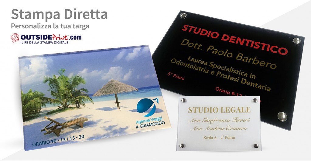 La realizzazione di una targa in plexiglass personalizzata è ormai alla portata di tutti e OutsidePrint propone nel suo negozio di stampa digitale online la possibilità di realizzare la tua targa per ufficio su Plexiglass trasparente oppure opaco oppure su Forex.
